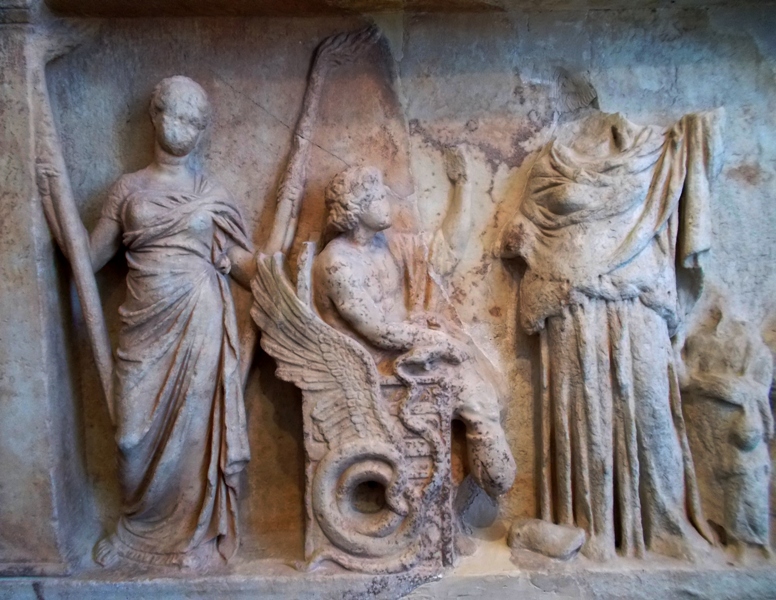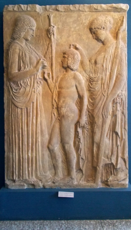 The anaglyph is very big. Height: 0.79meters width: 1.24 meters 4rth century b.C. Left we see Persephone holding torches, symbols of chthonic Gods and Goddesses. Triptolemus is sitting in his chariot of winged snakes (chthonic). Demeter gives instructions. Close to Demeter we see a team of her devotees.