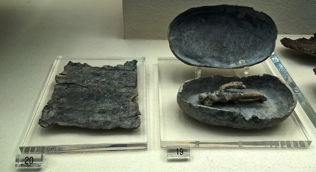 Photo from the museum of Kerameikos, Athens ancient agora In the left we see a part of a katadesmos full of binding magick and in the right a poppet (omoioma) from lead as a magganeia (part) of a curse spell. In the katadesmos the victim is bound in his/her tongue, soul, mind, actions, prudence, desires.