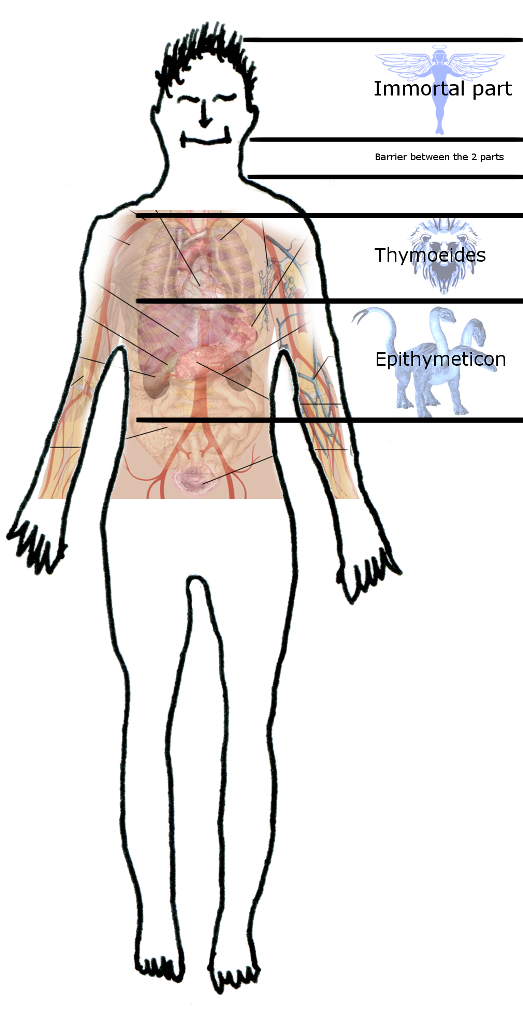 Though the immortal soul was placed in the head, they put the mortal below the head, so they created the neck as a barrier between those two parts. (Timaios 69 e) The mortal soul was subdivided in two parts. The one over the diaphragm consists of its higher part, the one below the diaphragm consists of its lower part. The division of the soul in three parts is necessary because as we see in Politeia/Country of Plato's the same function cannot tolerate to do or receive different things inside of her for the same matter (Book 4, 436 b). Socrates has analyzed those functions. There is one for learning. One for getting angry and of of desires both sexual and eating ones.