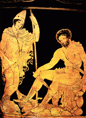 Odysseas, the king of Ithaca and the one who planed the fall of Troy is performing a successful necromantic rite under the instructions of Kirke, who is not present in the rite. In the night, he is digging a big whole in the earth, using his sword. He offers melikraton (milk and honey) around the whole and then he adds barley. After, he pours wine. Those are offerings. He is making animal sacrifices. He is killing two black sheep with the sword. Their blood is shed inside the whole. It is understood the meaning of the offerings. The blood is helpful to open a gate with the dead. This essence of life is giving access to the dead to our realm. Odysseas is making a promise to make more offerings when he will arrive to Ithaca. The remains of the sheep is thrown in the fire, again as an offering. Fire again acts as a gate to the dead. As the spirits arrive from that gate, Odysseas is using his sword as any magickian would do, to banish the spirits he doesn't want to be there, in the ceremony. Then, the great diviner ___ is coming and Odysseas is using him as a guide to the Underworld.