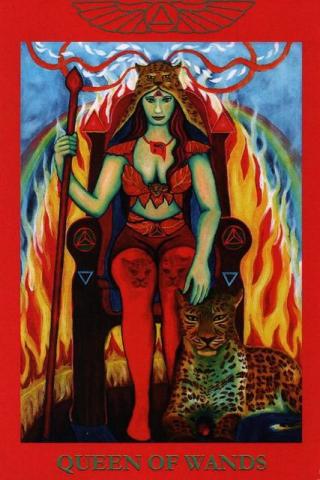 "A crowned Queen seated upon a throne with steady flames beneath. She wears mail and holds a conical-headed wand. A leopard is at her side. Her emblem is a winged leopard's head." -Book T