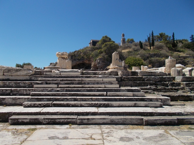 After Plutomium we see another exedra, a place in which honorary members sat and watched the pomp. South of exedra, there are stairs made by porolithos and other are sculptured in the rock. They lead to a small temple of Hekate. Hekate was leading with her torches the followers to telesterion, to learn the Mysteries. Moreover Hekate is the Goddess who helped Demeter find her daughter and she is the one who heard the abduction. Hekate and Persephone became close friends and Hekate lead Demeter to Helios. The power she has in Hades, let her lead Persephone to earth, when the deal with the Olympian Gods and Demeter was made. Maybe the temple of Artemis close to larger propylaia, was a temple to Hekate.