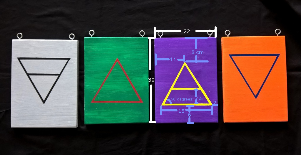 I have made mine out of wood. I cut the wood to the dimensions of 22 x 30 cm. Later I used sandpaper to make the edges smooth. With gesso I painted the surface twice and then applied the background color using acrylics. I tried to center the triangles. You can use my image or you can create better analogies. The important thing is to create an equilateral triangle (all three sides and thus the angles (60 degrees) are equal). For the wooden plaques I used, the sides of the triangle are 18 cm. To finish it off I used semi-gloss for the colors and gloss varnish fro the wood to keep the tablet protected from sun, air and water. It lasts longer and with gloss varnish the colors come "alive". I added screws with circular heads to hang the tablets on the walls. Use a compass to be accurate.