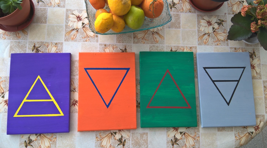 In the Golden Dawn Hermetic Tradition there is a highly important ritual, the Watchtower Ritual. It is done before every magickal working invoking the elementals at the four quarters using pentagrams, God names and Enochian magick. The structure of this ritual was copied later on and passed to other western magical traditions. Four elemental tablets displaying the elemental triangles hung on the walls, though in the Golden Dawn, the four Watchtower Tablets are more complex and they have their own life. Another variation, maybe for a Wiccan Circle, is to put the ones with the elemental triangles just outside the circle and have the elemental candle inside the circle to illuminate the tablet. Those tablets help with the focussing, orientation and invocation of the energies in the space.