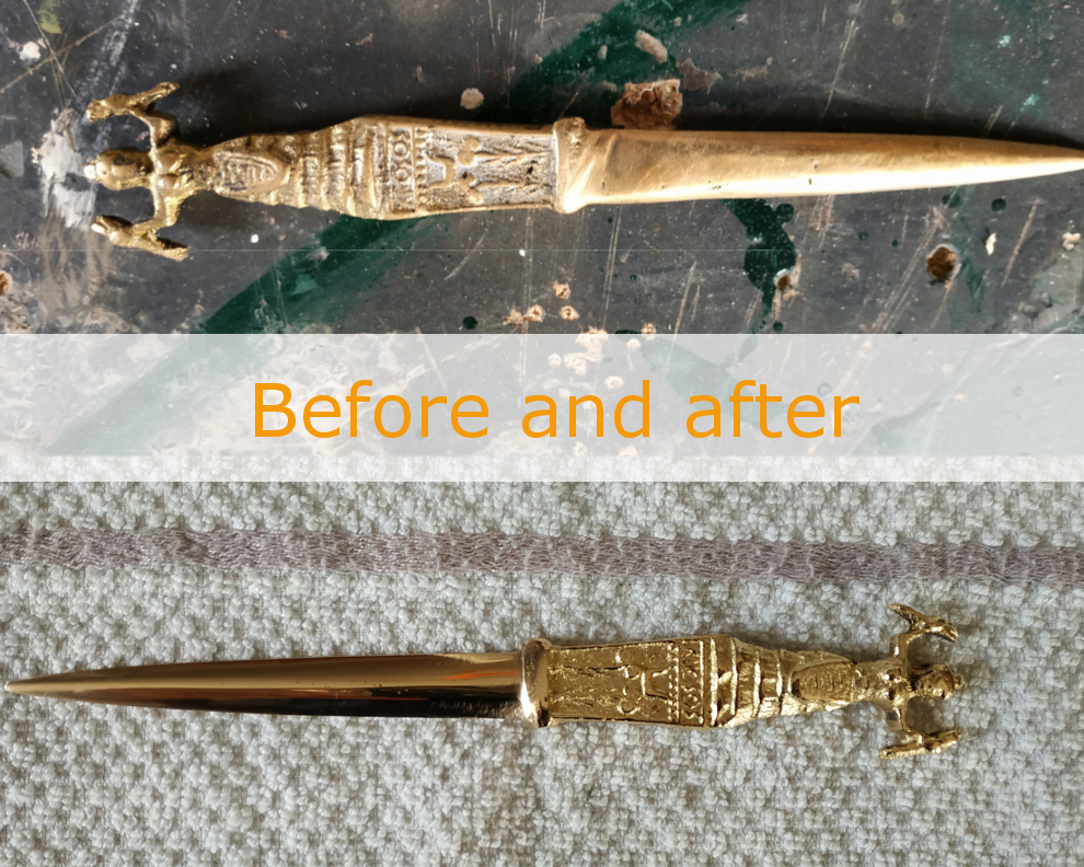 If you want to work with the faeries using faerie/fairy magick you need a bronze athame. So, I had to buy bronze and make it or find a bronze knife. I had worked with bronze before, so I have the knowledge to make a knife from metal. I was going to a meeting and I passed through an antique store. Something made me stay there and see the items. I found some old letter opener knives, which were in terrible condition. After finding one that is linked with Hekate and the ancient Minoan civilization, I made an offer to the seller and I got it at a reasonable price. Its main flaw was in the bevel close to the base of the ricasso. It was full of scratches and uneven and the knife didn't cut at all.