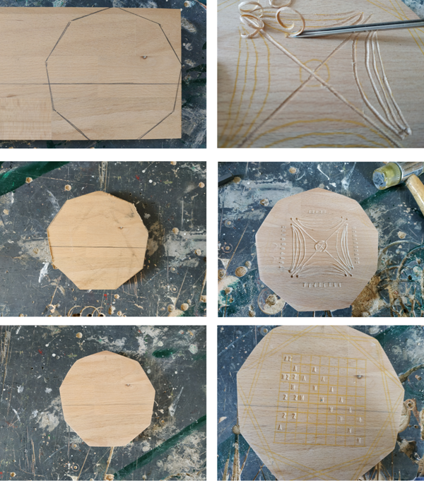 I cut the wood with a hand saw in the shape of a hexagon. I decided to make the backside passive, so I used the router to cut the edges of the wood in a triangular shape, which is more pleasant to the eye and gives depth to the front side. I used a chisel to trace the hexagram and the seal of the Moon. For the letters, I used iron cast hammered letters. I also tried to make the lines with the chisel, but due to the vertical lines of the beechwood (it is a hardwood), I couldn't do it. I also used the Dremel, but I had the same problem. Initially, I painted the wood silver, but I didn't like the result, so I sanded it again and I used violet. The flashing color was another big problem. I tried my brushes, but I couldn't do it. Not to mention, that the violet was inside the letters and I couldn't paint them with gesso and then with the yellow color, because the layers filled the embossed letters. So, I used a colored marker. I dried the paint with a hairdryer and then I passed two layers of polyurethane gloss varnish.