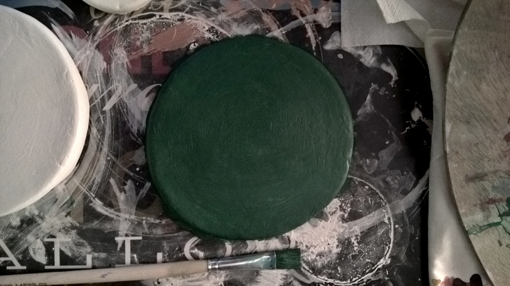 Take the gessho and paint the upper part of the plaque and the sides too. Gessho is a layer you put before acrylics. Let the layer dry. Paint the background color. (Image 1)