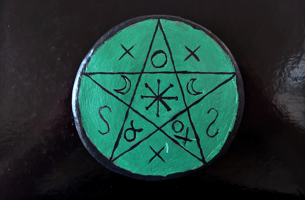The pentacle is a traditional symbol of Witchcraft and the main symbol of Wicca. It represents many things, health, the human body, the elements of nature, the proccess of making things using a divine energy etc. In the altar the pentacle is a tool, which represents the element of the earth. It is one of the simplest tools to make. A stone or a wooden plaque is taken and you just draw a pentacle. Let's see something different.