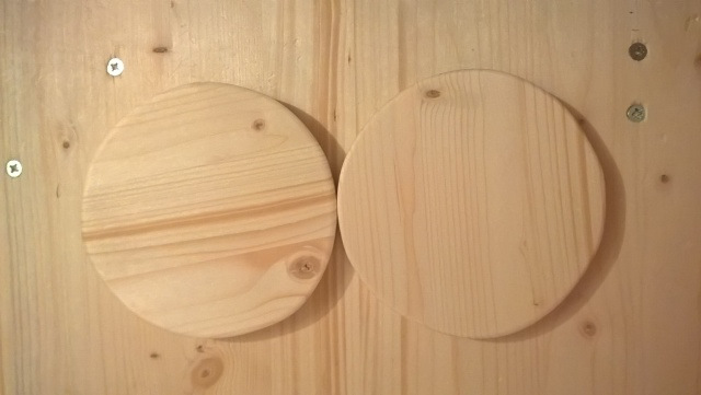 Buy the wood from your local store or ask your woodworker to cut for you circle with 12 cm diameter. If you want to do it by your own, use the jigsaw by adjusting it to cut plastic (no 1) with fast movement for the saw (no 5). The saw should be an appropriate for fine cutting of wood. Make sure you have taken all the protection and the wooden surface is solid and doesn't move as you use the jigsaw. Stability is everything here. Make sure you wear glasses, a hat, gloves and a mask for the dust. Cut as fine as you can the wood and then with the smirdex paper make it smooth and circular. It takes time.