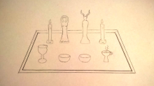 Lay down your deipnon in a plate. Light the candles, incense and calm yourself by relaxing the body. Use a brass instrument to make sound. You can use brass jingles for that. You are going to produce sound with three strikes. Make sure you have experimented before with your musical instrument.